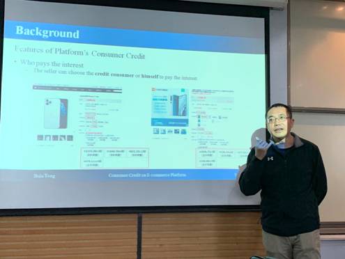 许明辉教授首先向大家介绍了佟世璐副教授的学术经历和主要科研成就。随后,佟世璐副教授开始了精彩的学术报告。近年来,网上销售总量保持持续增长的态势,有数据显示,网络平台提供的分期付款模式为商家的销量增长贡献了巨大力量。佟世璐副教授从广为大众所熟知的“京东白条”和“蚂蚁花呗”引入,用深入浅出的语言向师生们介绍了报告的主要内容。