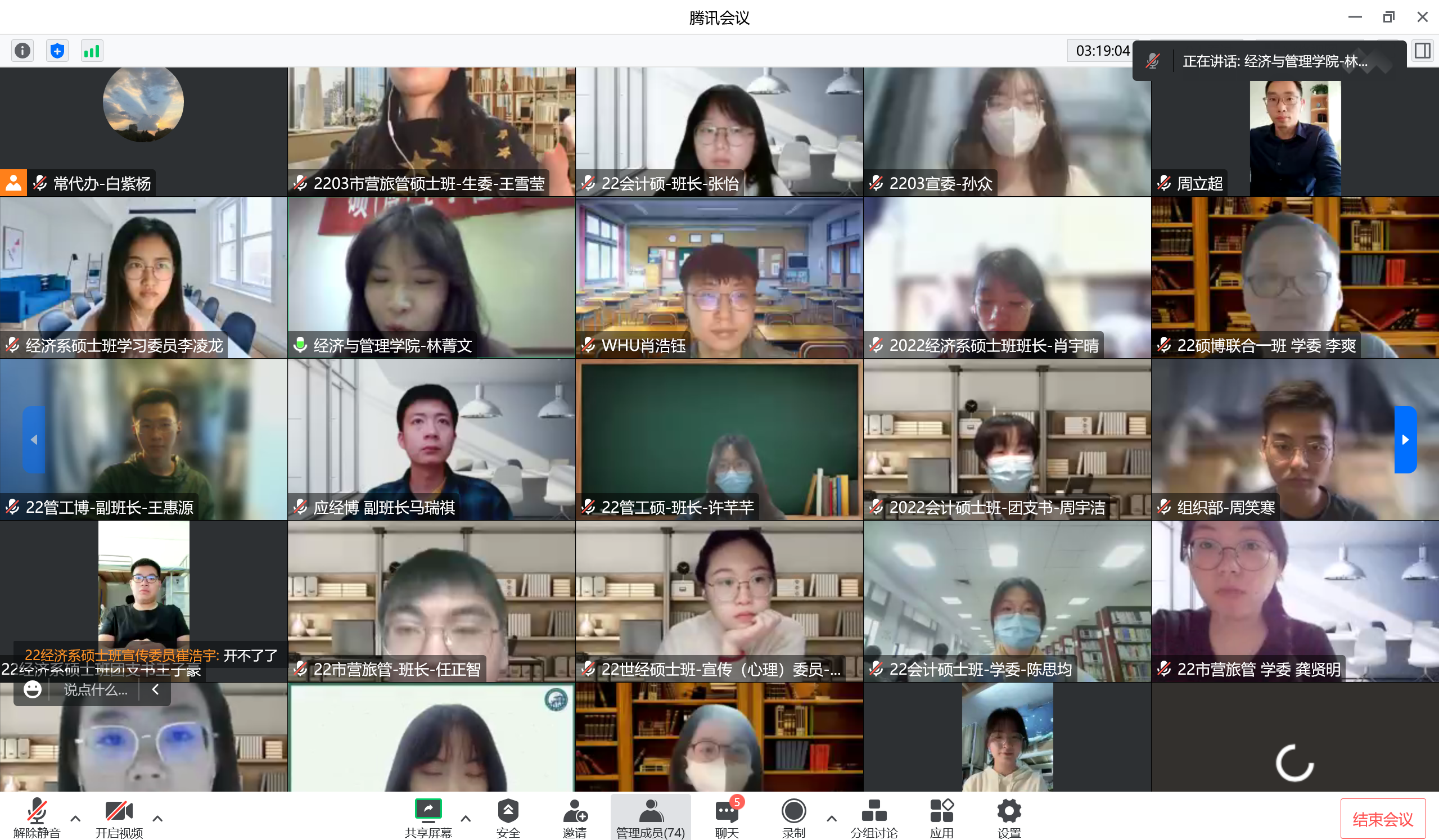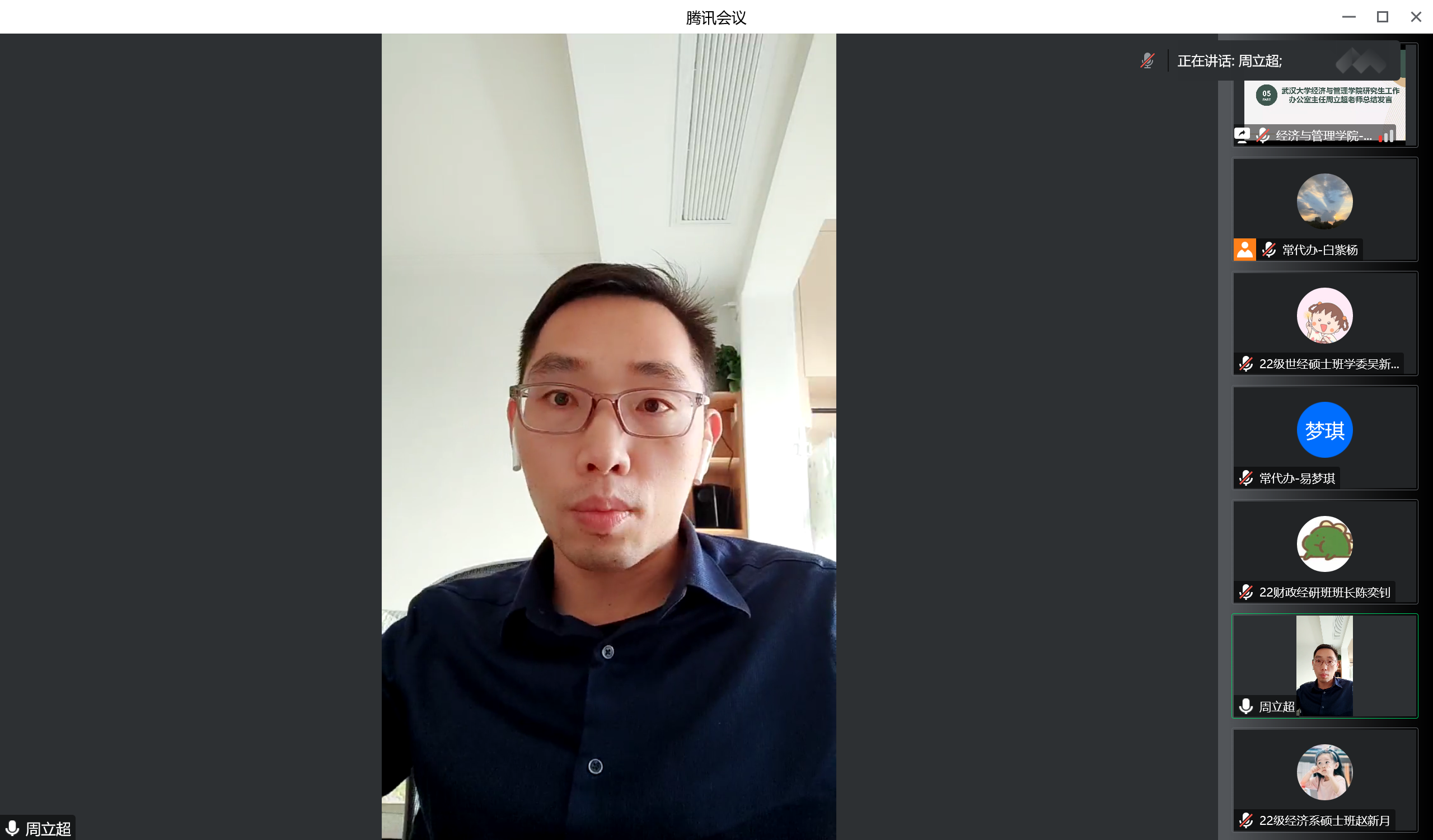然后,各位班委代表踊跃发言。其中2022级应用经济学博士班班长邓龙真同学提出班委工作要牢记三个量:第一个是把握好提前量,预留出准备和容错的时间;第二个是精简信息量,接到通知后需要二次加工,把重要信息放在最醒目的地方;第三是尽量减少同学们的工作量,这也是班委服务同学的宗旨。各位代表从自己的角度出发,分享了各自在班级工作中的所见所感所思,对于班级工作的开展有丰富的借鉴意义。