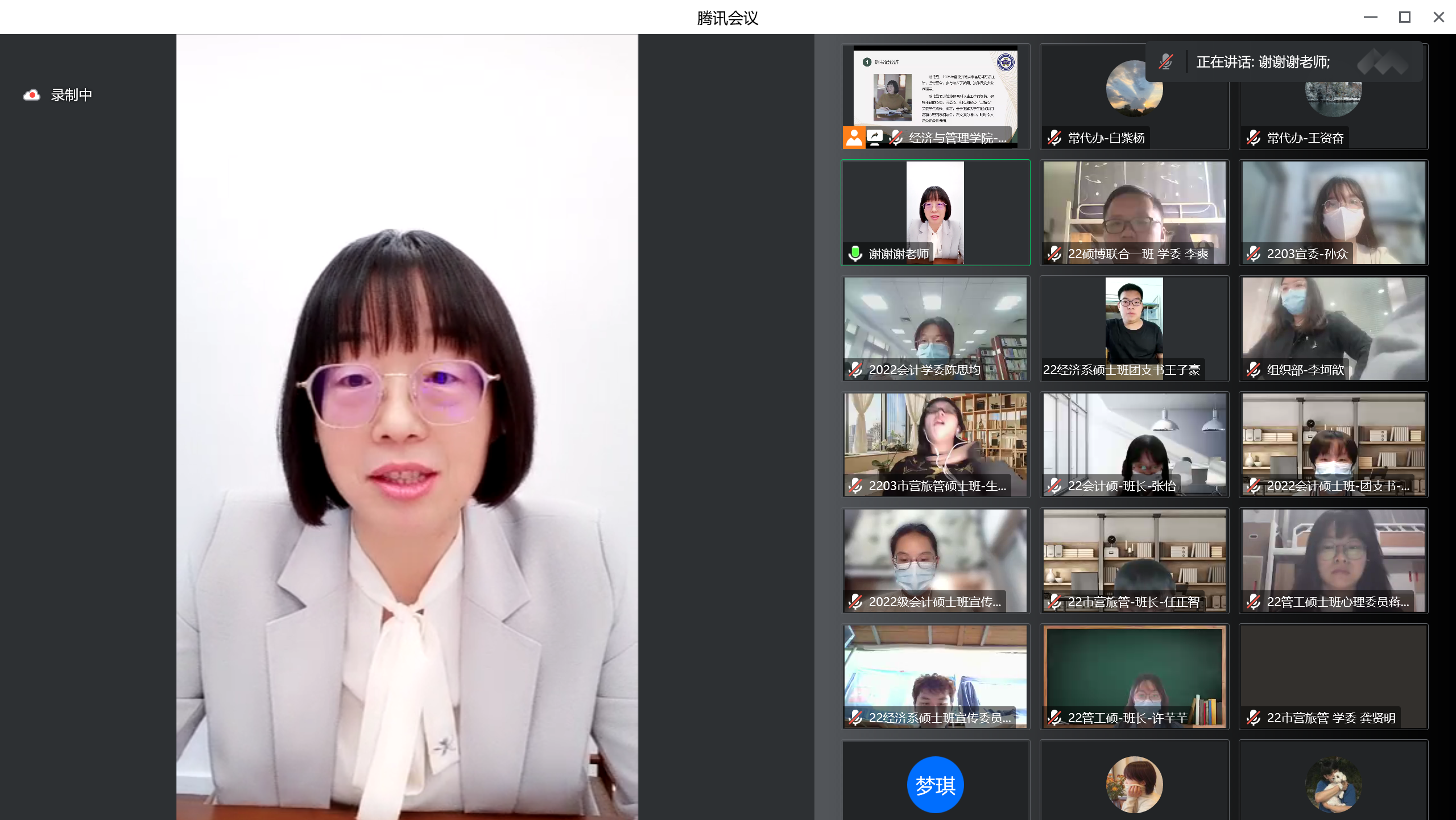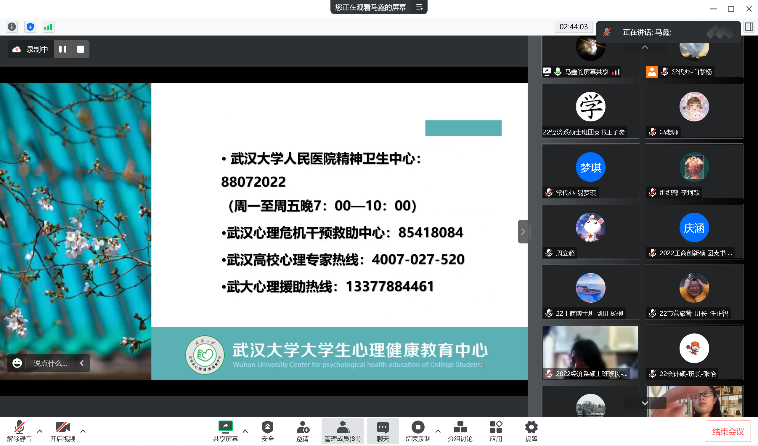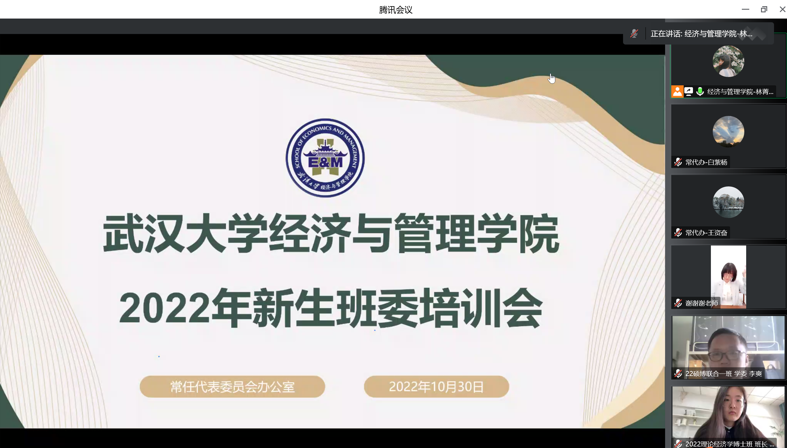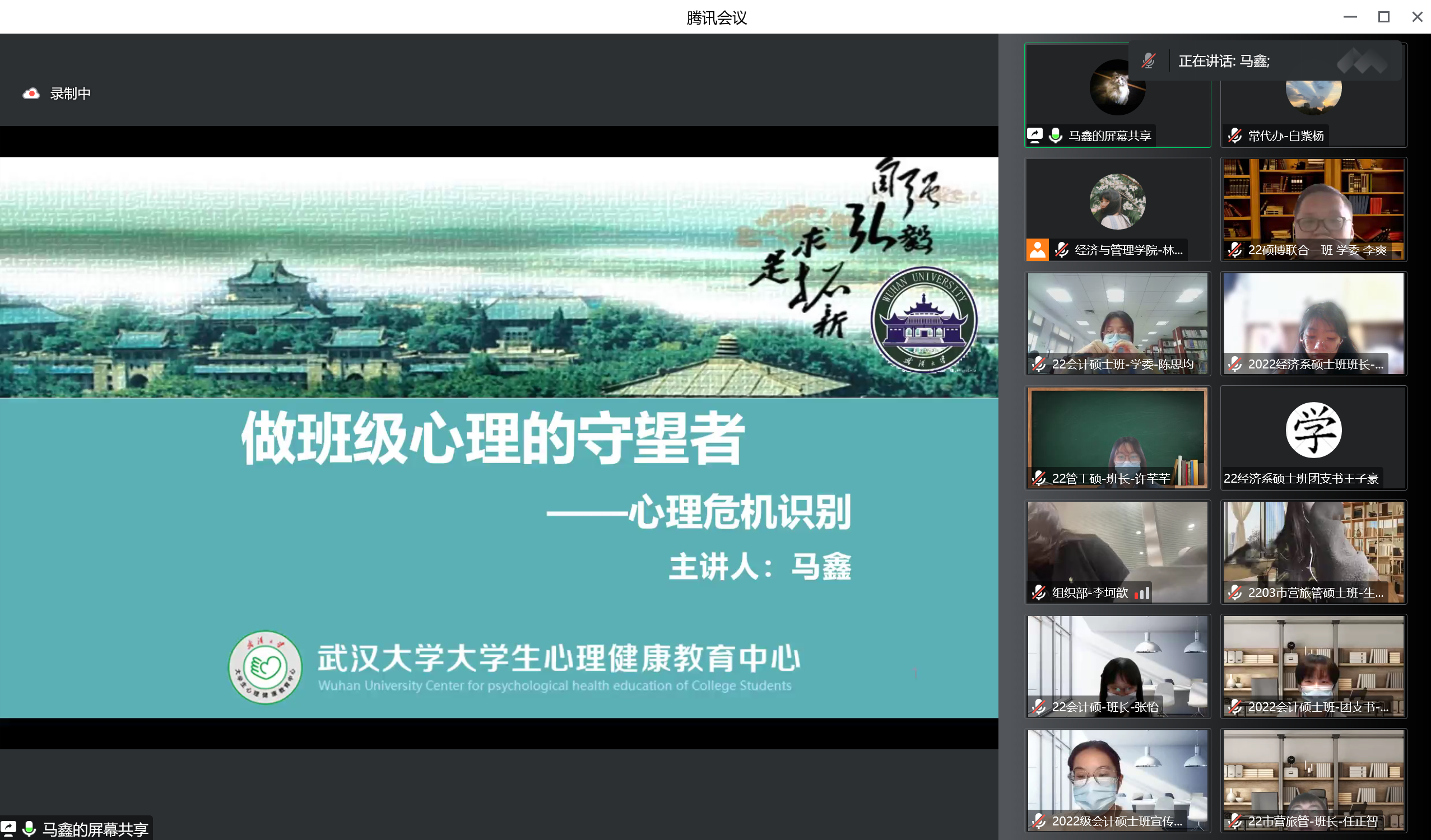 2022年研究生新生班委培训大会暨心理健康教育讲座在线上顺利举行,本次大会邀请到了武汉大学心理健康教育中心专职教师马鑫老师作为本次“心理危机识别”主题讲座的嘉宾,出席本次大会的学院领导老师还有威尼斯人平台-澳门威尼斯人网站