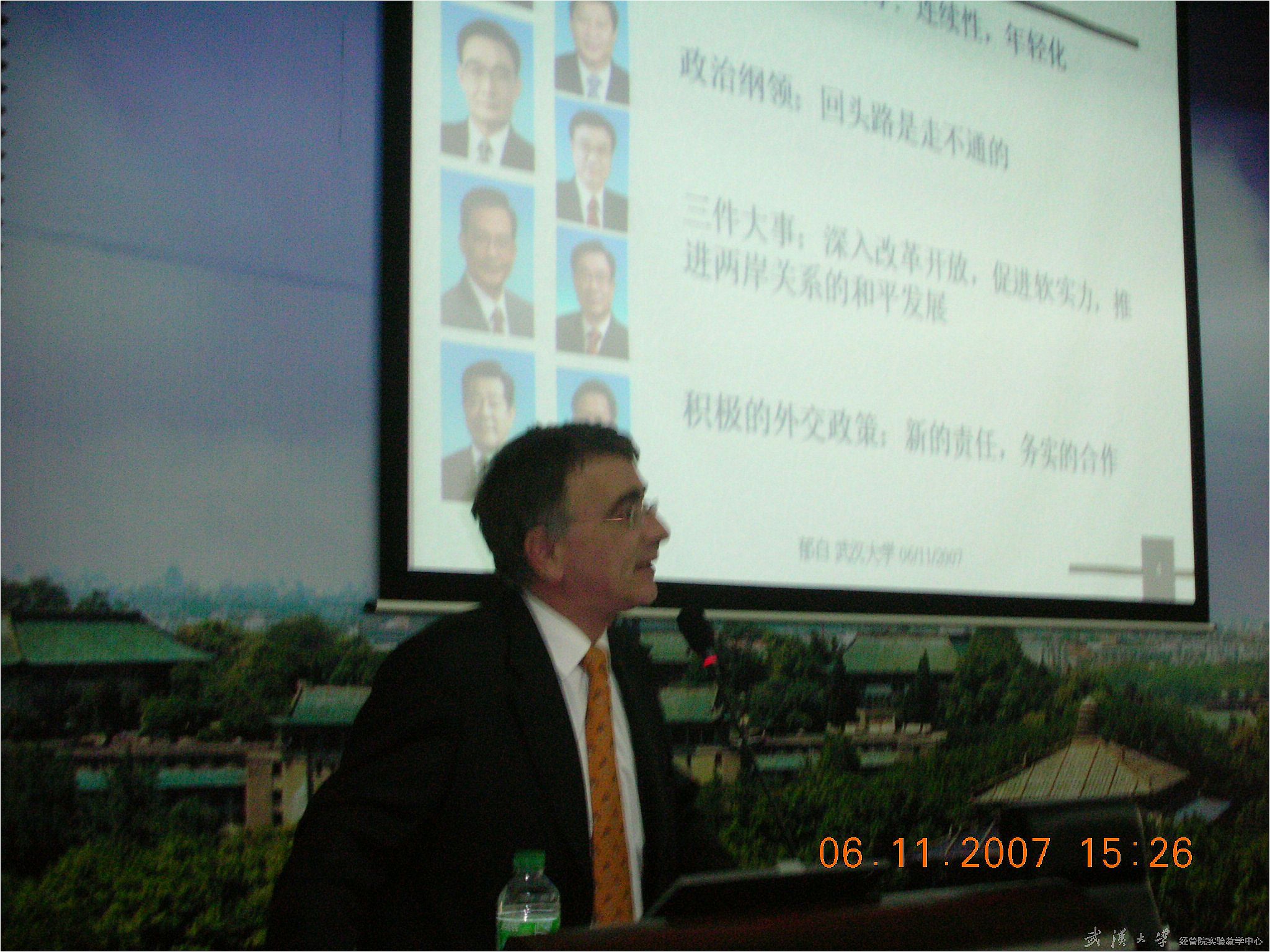 11月6日下午,法国驻华大使馆公使衔参赞郁白(Nicolas Chapuis)先生访问威尼斯人平台 ,并在威尼斯人平台 学术报告厅作了题为“2007年看中法关系前景”的演讲。演讲由副校长周创兵主持。郁白先生从“政治大年”、“共识的基础”、“争论的问题”以及“前景”四个方面深入分析了中法关系。