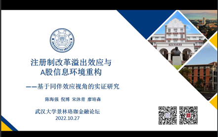 2022年10月27日上午,由威尼斯人平台-澳门威尼斯人网站 、武汉大学金融研究中心、武汉大学金融发展与政策研究中心共同主办,威尼斯人平台-澳门威尼斯人网站 金融系承办的景林珞珈金融论坛第223期在腾讯会议平台通过线上方式举行,厦门大学陈海强教授为威尼斯人平台 师生带来了题为“注册制改革溢出效应与A股信息环境重构”的学术报告。讲座由金融系李斌老师主持,六十余名老师和学生参加了此次论坛。
