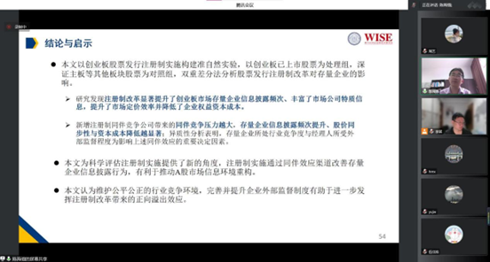 紧接着,陈海强教授向我们展示了主要的研究发现。注册制改革显著提升了非注册制下上市的存量企业信息披露频次,丰富了市场公司特质信息,提升了定价效率并显著降低了上市公司权益资本成本。同时,同伴压力越大,非注册制上市的存量企业信息披露频次提升,股价同步性与资本成本降低越显著。异质性分析考虑了行业竞争程度、外部监督强度等。研究结果证实,企业所处行业竞争越高与经理人所受外部监督程度为影响上述同伴效应的重要决定因素。